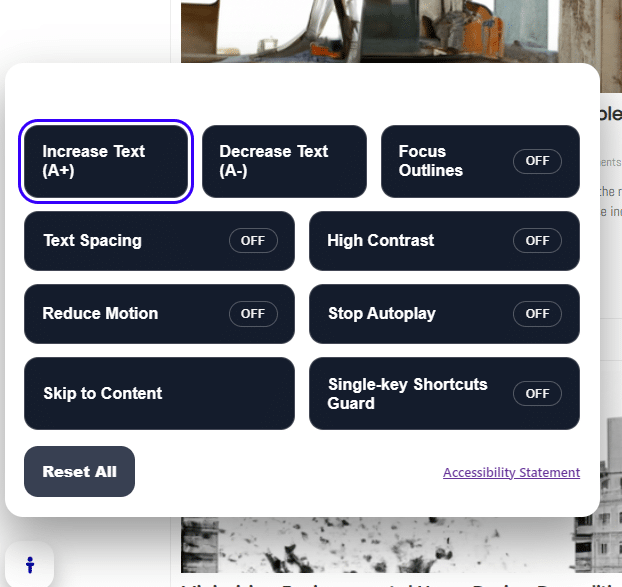 Visitors can click the Accessibility button to open the control panel. From there, they can: